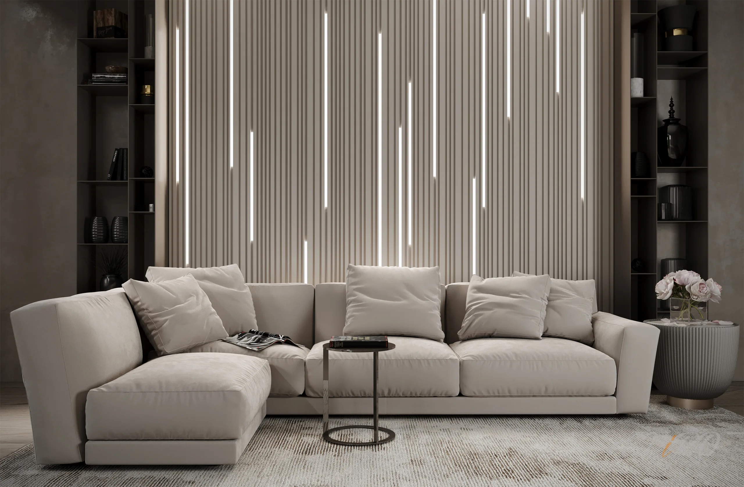 Панели с интегрированными световыми линиями создают визуальную иллюзию глубины и объема на стенах, придавая помещению живость и привлекательность. Такие гипсовые 3D панели идеально подходят для оформления разнообразных объектов, включая рестораны, гостиницы, офисные пространства и жилые интерьеры.