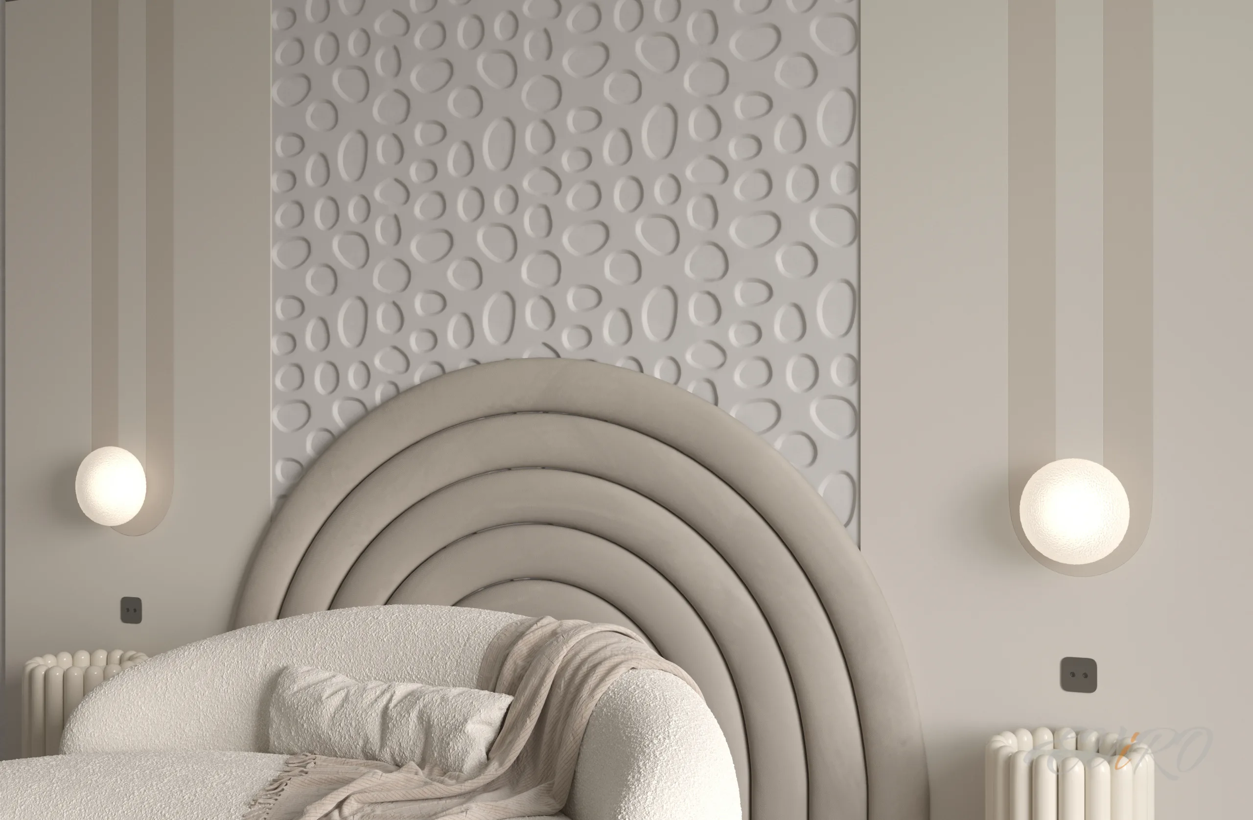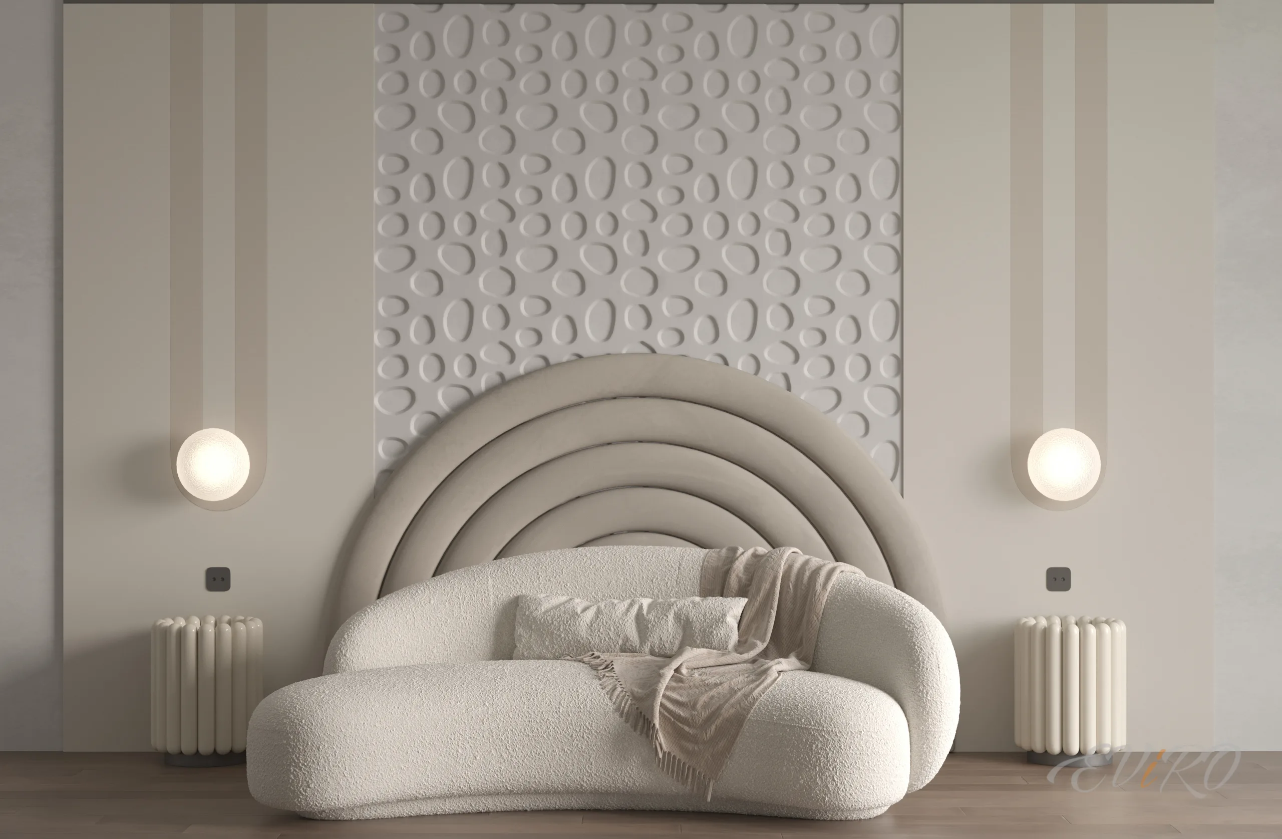 Гипсовые панели ЕВиРО "Кругляк" (гипсовые панели M-43) создают уникальную атмосферу в любом интерьере. Их сложная текстура и гармоничные формы напоминают о живой природе, придавая помещениям тепло и уют. Применение этих панелей в спальне поможет вам создать пространство, где можно отдохнуть и восстановить силы. Спокойные оттенки и рельефная поверхность визуально увеличивают пространство, делая его более воздушным и комфортным.